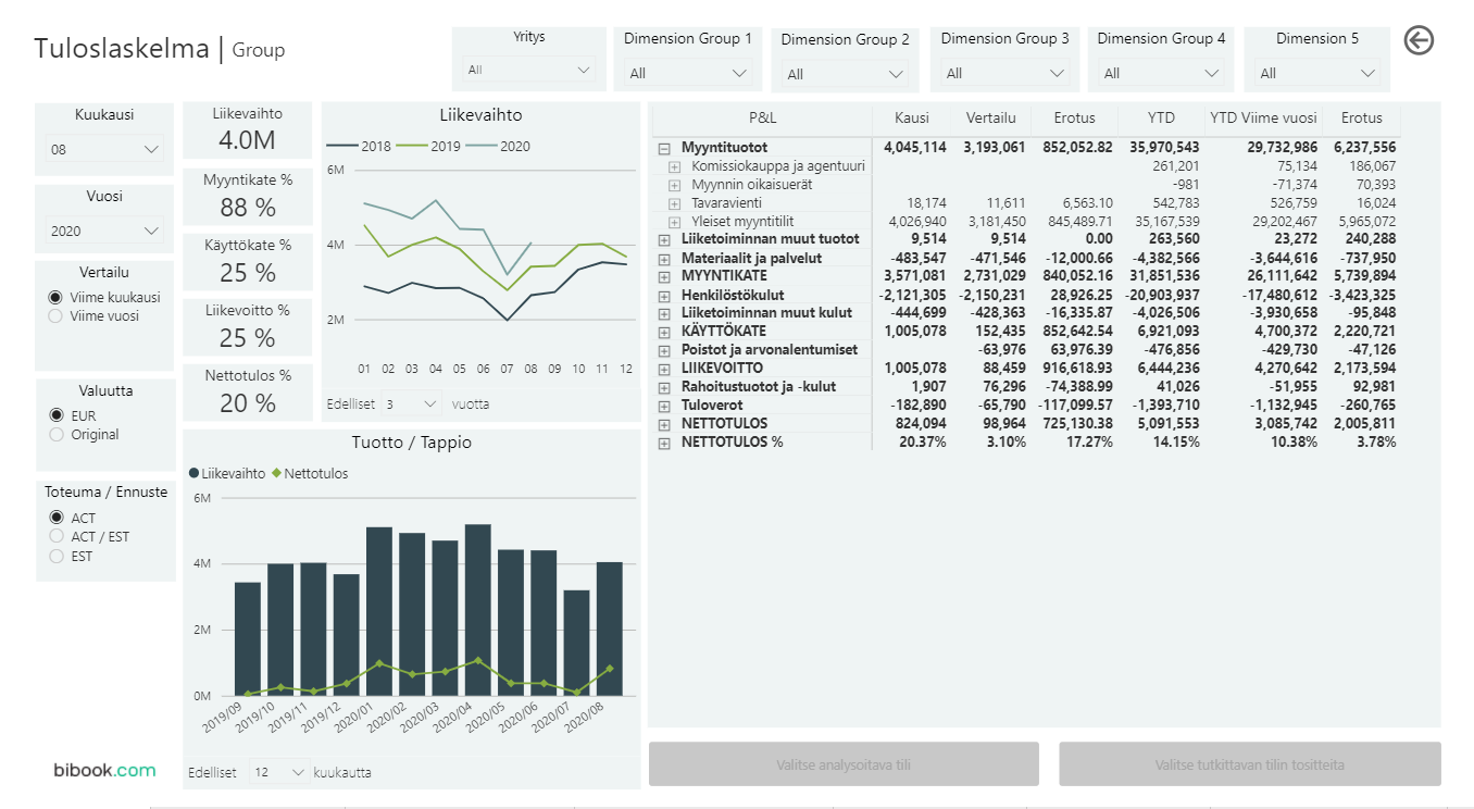 BI Book mahdollistaa liikevaihdon ja tuloksen tarkastelun rullaavana tai kumulatiivisesti – liikevaihtoa voi vertailla luotettavasti vahvojenkin kausivaihteluiden keskellä. Pystyt vertailemaan liikevaihtoa ja kannattavuutta myös organisaatiosi dimensioiden välillä. Sen lisäksi, voit helposti seurata ja tutkia liiketoiminnassa tapahtuvia muutoksia porautumalla kauden tapahtumiin tositetasolle asti. BI Bookin nettisivuilta pääset lukemaan tarkemmin eri integraatioista järjestelmäkohtaisesti. BI Book voidaan integroida esim. seuraavien järjestelmien kanssa: Netvisor, Procountor, Fortnox, Lemonsoft, QuickBooks, XERO ja Directo.
