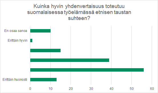 Kyselymme perusteella suomalaisessa työelämässä on erityisesti kehitettävää etnisen taustan yhdenvertaisuudessa. Vastaajat antoivat etnisen taustan yhdenvertaisuuden toteutumiselle keskimäärin arvosanan 2.74 (asteikko 1-5). Vastaajista naiset (ka. 2.67) kokivat yhdenvertaisuuden toteutuvan huonommin kuin miehet (ka. 3.10).